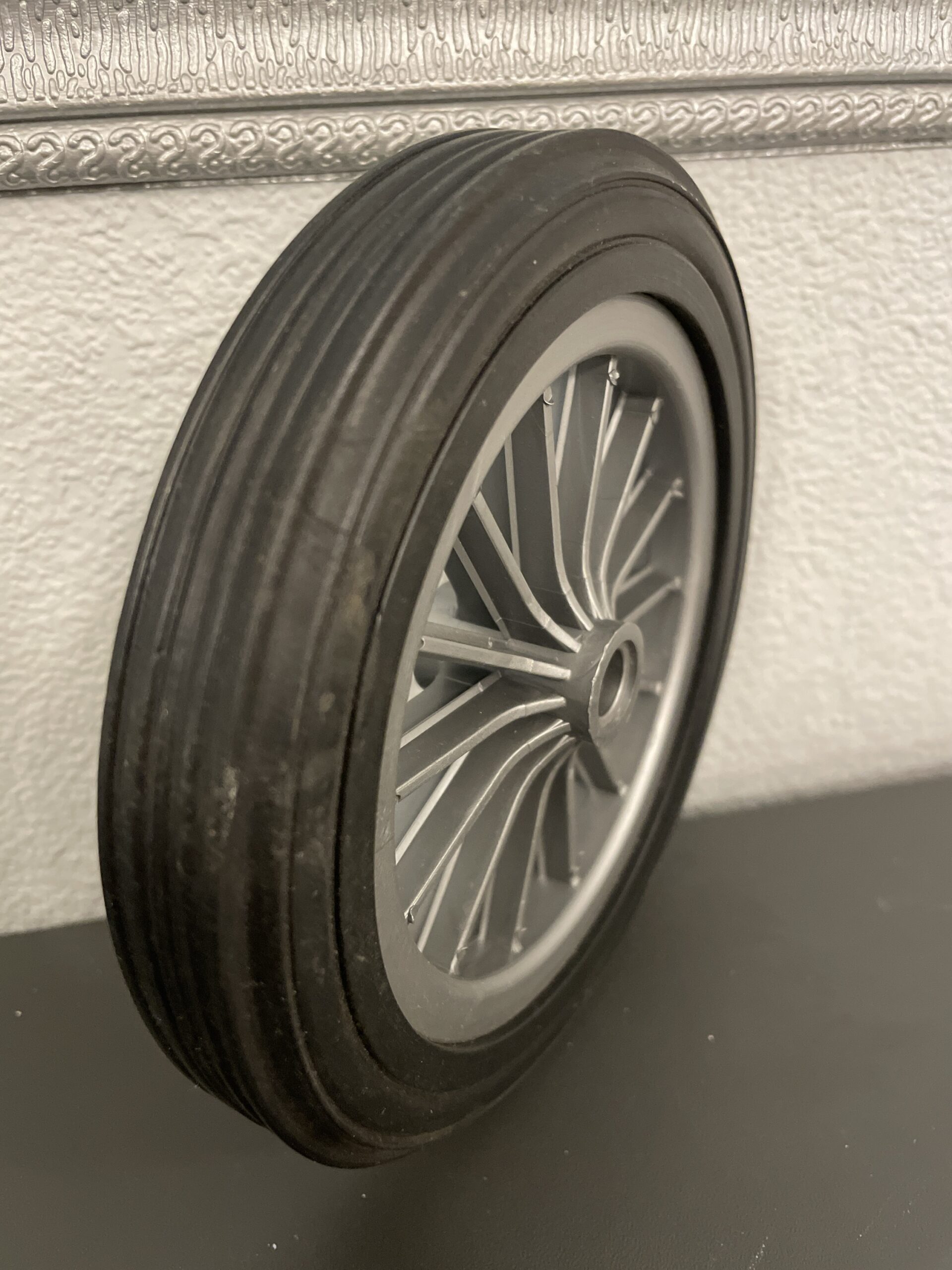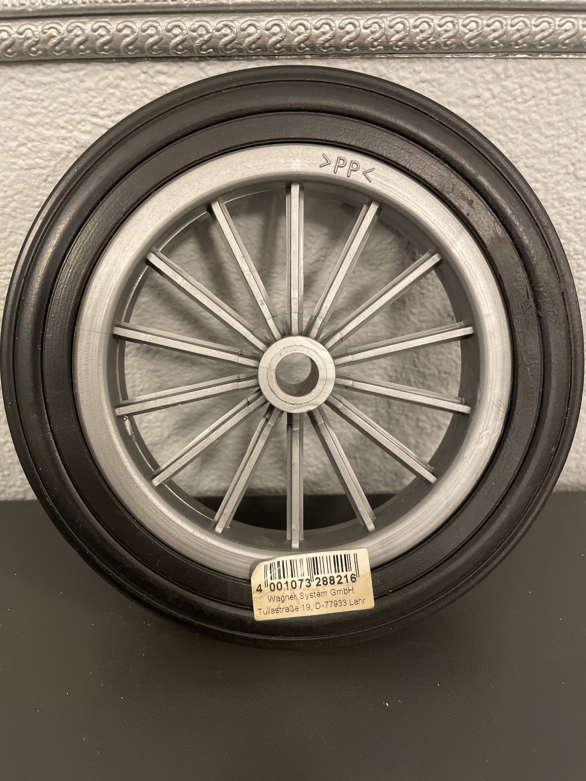 Sølvgrå gummihjul. 14,3 cm diameter, bredde 2,3 cm, hul 1 cm.